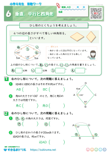 垂直・平行や台形・平行四辺形・ひし形の性質や、そのかき方を学習します。対角線の特徴に着目して、四角形の性質をとらえるように理解しましょう。