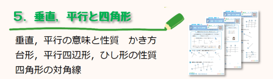 「角度」「がい数」「垂直・平行と四角形」「面積」「小数と整数」「直方体と立方体」など、計算能力の定着や四捨五入、図形の構成要素や位置関係などを学習していきます。